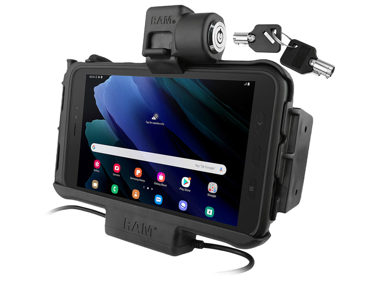 These Samsung Galaxy Tab Active3 powered vehicle docks include power and power + data options, non-locking, combination lock, keyed lock and dual USB versions. All holders conveniently connect to nearly any RAM® vehicle mount base, while the rubber ball and socket mounting system allows users to efficiently switch between portrait and landscape modes.