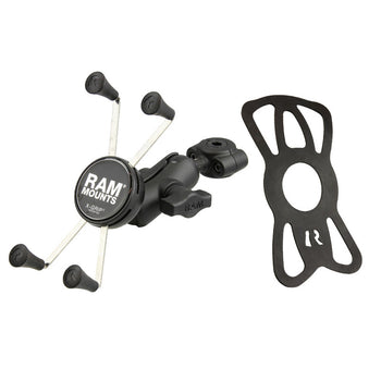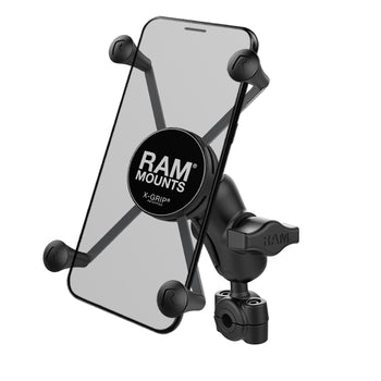 Take your mobile entertainment on the road with the new RAM® Torque™ handlebar and rail mounting base. We’ve paired a B-size 1” rubber ball base that accommodates bars 3/8" to 5/8” in diameter with a B-size short length arm and the dynamic X-Grip® for larger phones. Sizing inserts are included to provide a snug fit and offer additional protection for the rail. The mount utilizes nylon-insert lock nuts to prevent loosening in high vibration environments. This low-profile mount is the perfect way to secure your personal electronics and small accessories in any high-vibration environment. The included X-Grip® cradle has a clean and clever four leg design that sports great holding power without hiding your phone behind foam pads and plastic. The spring loaded X-Grip® cradle expands and contracts, allowing for a perfect custom fit of your cell phone. The perfect complement to the modern sleek interior of today's vehicles, the RAM X-Grip® is the cell phone cradle evolved. The X-Grip® includes a device tether recommended for outdoor applications. The cradle is compatible with handheld devices that will fit the dimensions listed below. It is important to verify the dimensions of your handheld device with a case/sleeve/skin when determining the overall size.