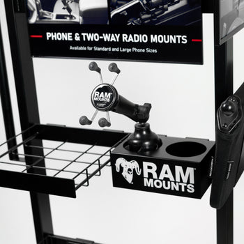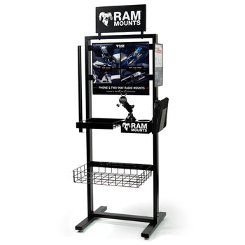 This powder coated steel standing floor display (RAM-DISPLAY-MODULAR1-GENERIC) is the perfect in-store display for housing packaged RAM® product and showcasing demo product with the included cup holders, a Tough-Wedge™ slotted holder, and 1" bar for mounting up to four clamping style mounts. This stand is easy to assemble and includes one half-sized basket and one full-sized basket for housing packaged RAM® product in boxes. Mount up to four clamping style mounts to the 1" diameter attachable bar and pair with any small device holder for the ultimate in-person selling tool. Also included is one 16" x 14" attachable signage with lifestyle imagery and one 8.5" x 11" attachable infographic signage featuring the RAM® Tough-Wedge™.