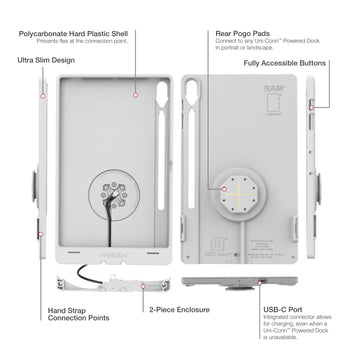 | Overview | The IntelliSkin® Thin-Case™ for Tab S10+, S9+ & S9 FE+ (Rear Pads) - Gray (RAM-GDS-SKIN-SAM96-TCB-GRY) is a low-profile, two-piece device enclosure designed for the GDS® Uni-Conn™ docking platform. The GDS® connection style integrates a USB-C connector that routes through the case to the pogo pads integrated into the GDS® Uni-Conn™ adapter. The robust polycarbonate shell protects your device from daily wear and tear while the complete enclosure makes it difficult for unauthorized users to access the tablet, providing additional peace of mind for tablets mounted in high-traffic environments. The flat, ruggedized pogo pad contacts are made for repetitive docking to protect the device's port and collect less dirt making them easier to clean. An integrated USB Type-C connector at the bottom of the case allows for device charging even when you don’t have a GDS® Powered Uni-Conn™ Dock available. The light gray aesthetic is ideal for sophisticated, bright workplaces in industries such as retail, medical, and more. The IntelliSkin® Thin-Case™ for the Samsung Tab S9+ & S9 FE+ is only compatible with GDS® Powered Uni-Conn™ docks, easily identified by the GDS® Powered Uni-Conn™ Adapter emblem. One Dock to Connect Them All™. Always Protected. Always Connected.® |
