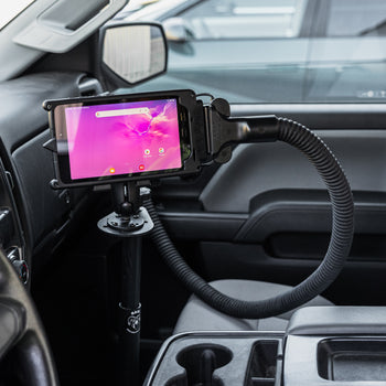This RAM® Vent-Temp™ temperature module accessory (RAM-VENT2-RND-50U) installs to the front of any RAM® or GDS® dock and attaches to circular A/C vents 3.67" in diameter, using included zip ties. This version of the RAM® Vent-Temp™ directs air produced by your vehicle's A/C system to either cool, or heat up the front of the docked phone or tablet. This is ideal for environments where the device needs to be cooled off or heated up to maintain operating temperatures during critical work functions, or to defrost the front of the tablet to keep your touchscreen operable. When installed correctly and vent cover is attached to a circular air vent, both the hose adapter and front dock attachment feature integrated magnets for easy break-away when the RAM® Vent-Temp™ is not needed, or gets caught on something that could tug on the hose. The 50" included flexible hose can be cut to the desired length of reach from vent to dock.